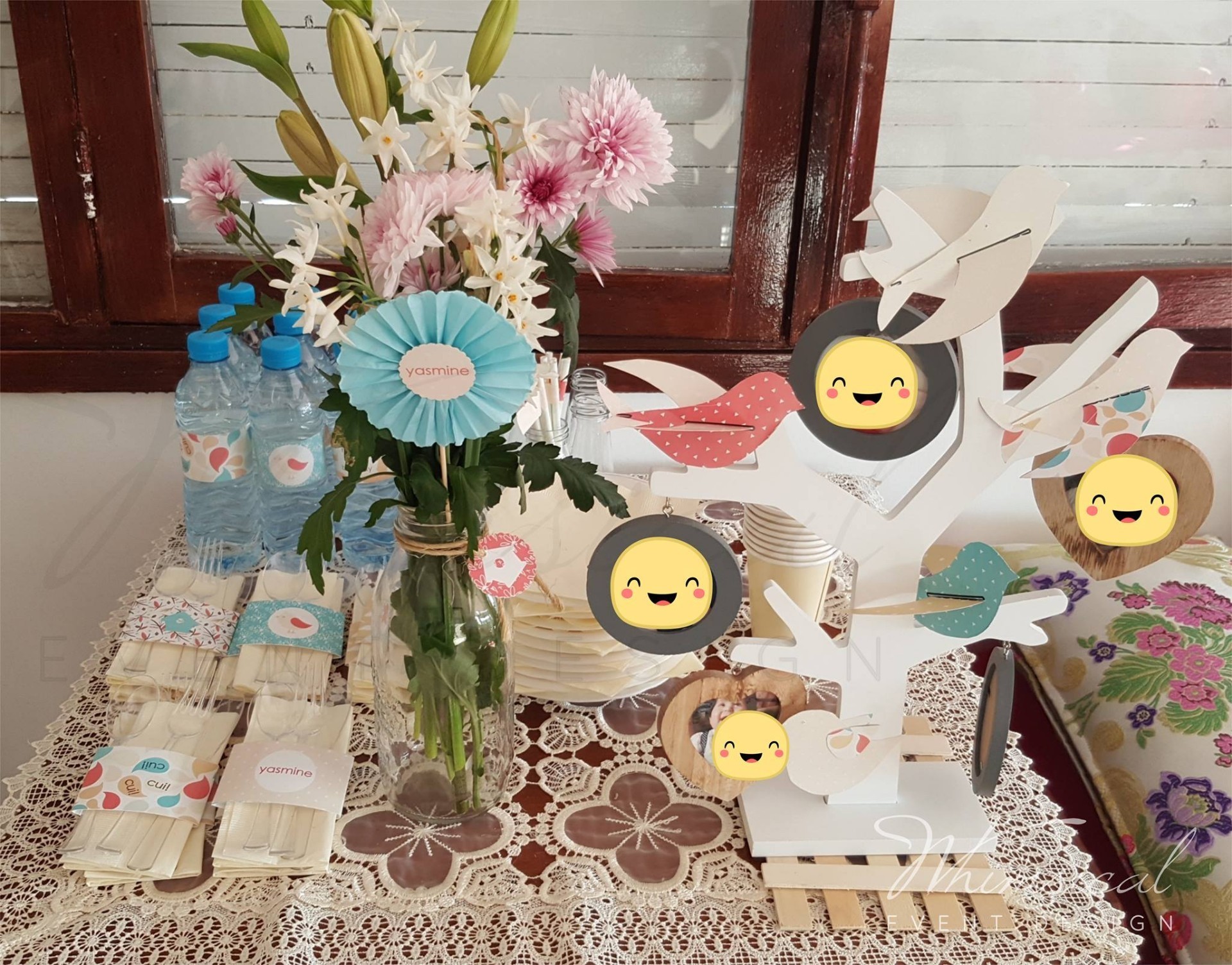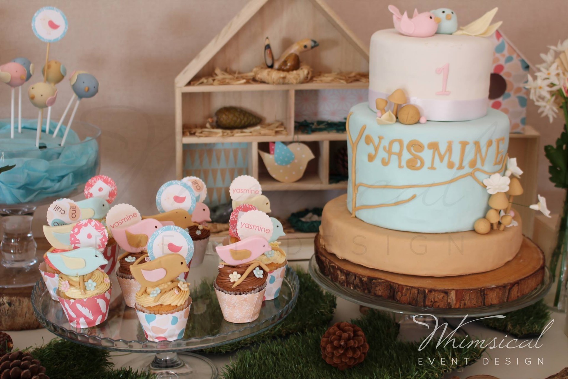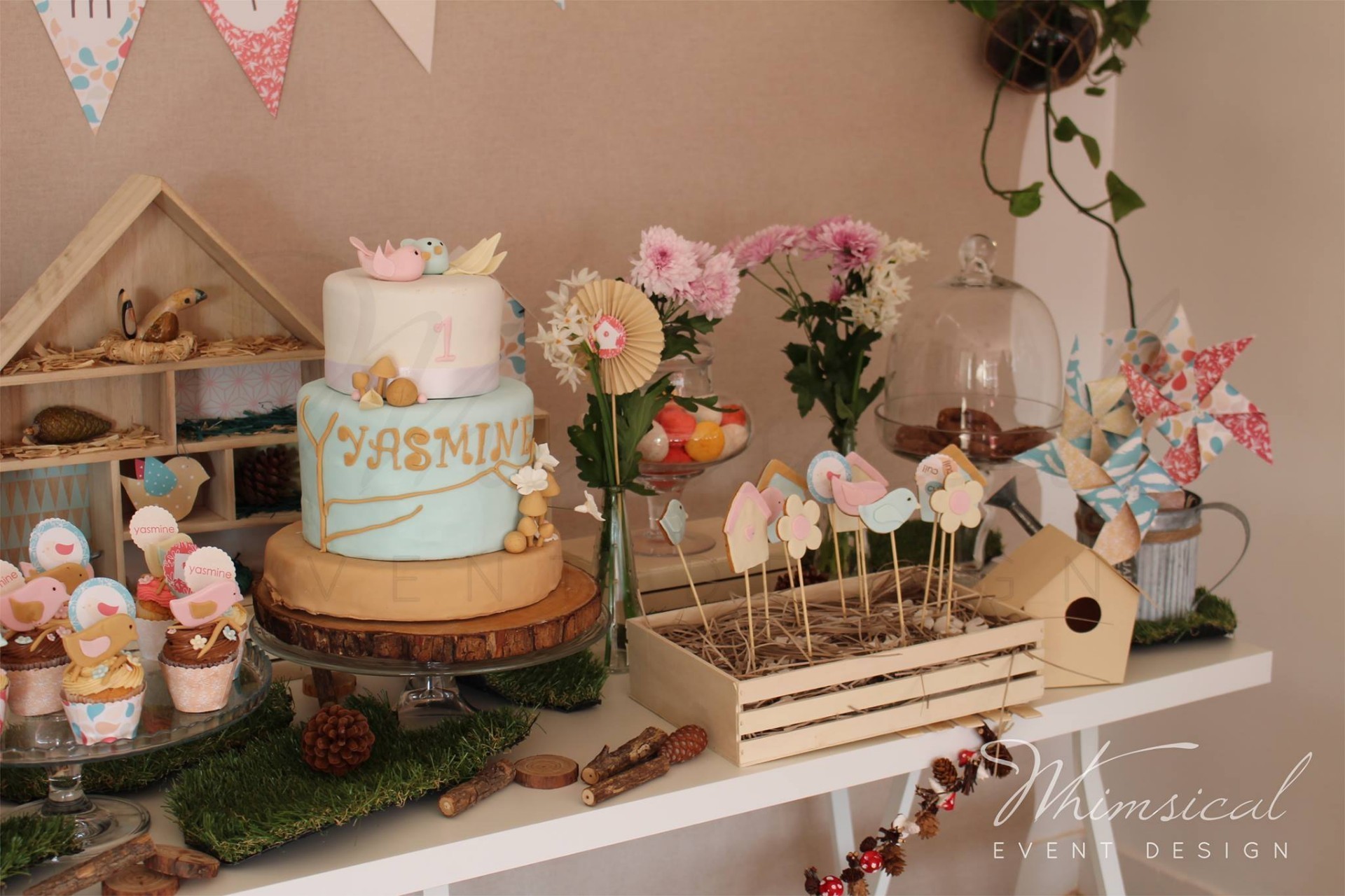 Des oiseaux partout pour ce thème adorable, avec de jolies couleurs pastels pour représenter leur douceur, des oiseaux libres dans les bois, avec leurs petites maisons. Des gâteaux et friandises au thème, des plantes, fleurs et guirlande en pin pour faire sentir les bois et des oiseaux accrochés au dessus de nos têtes.