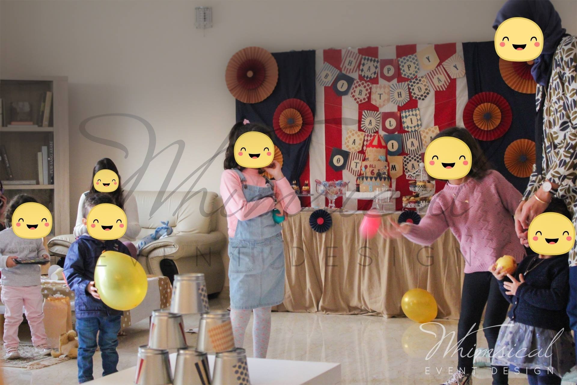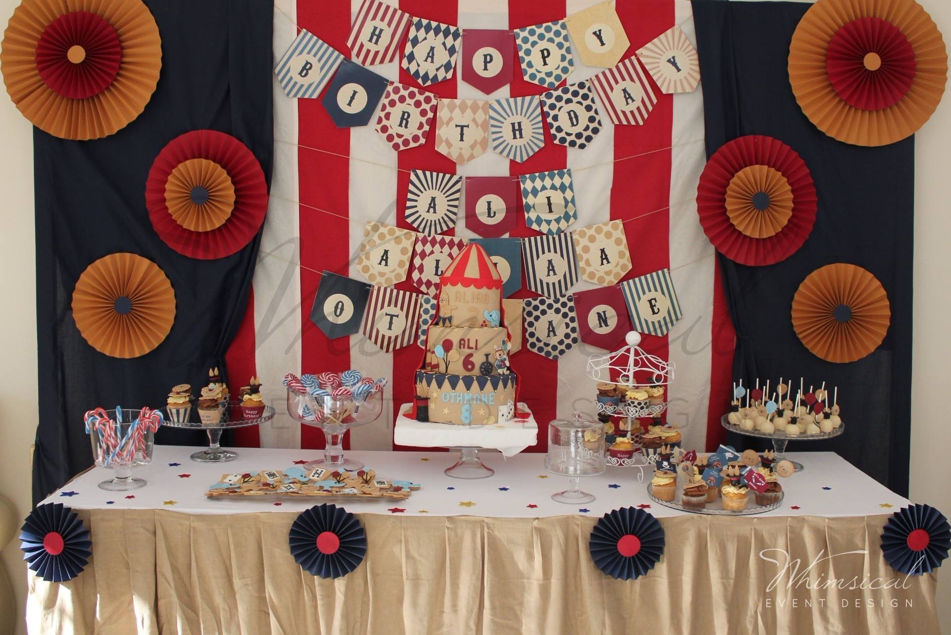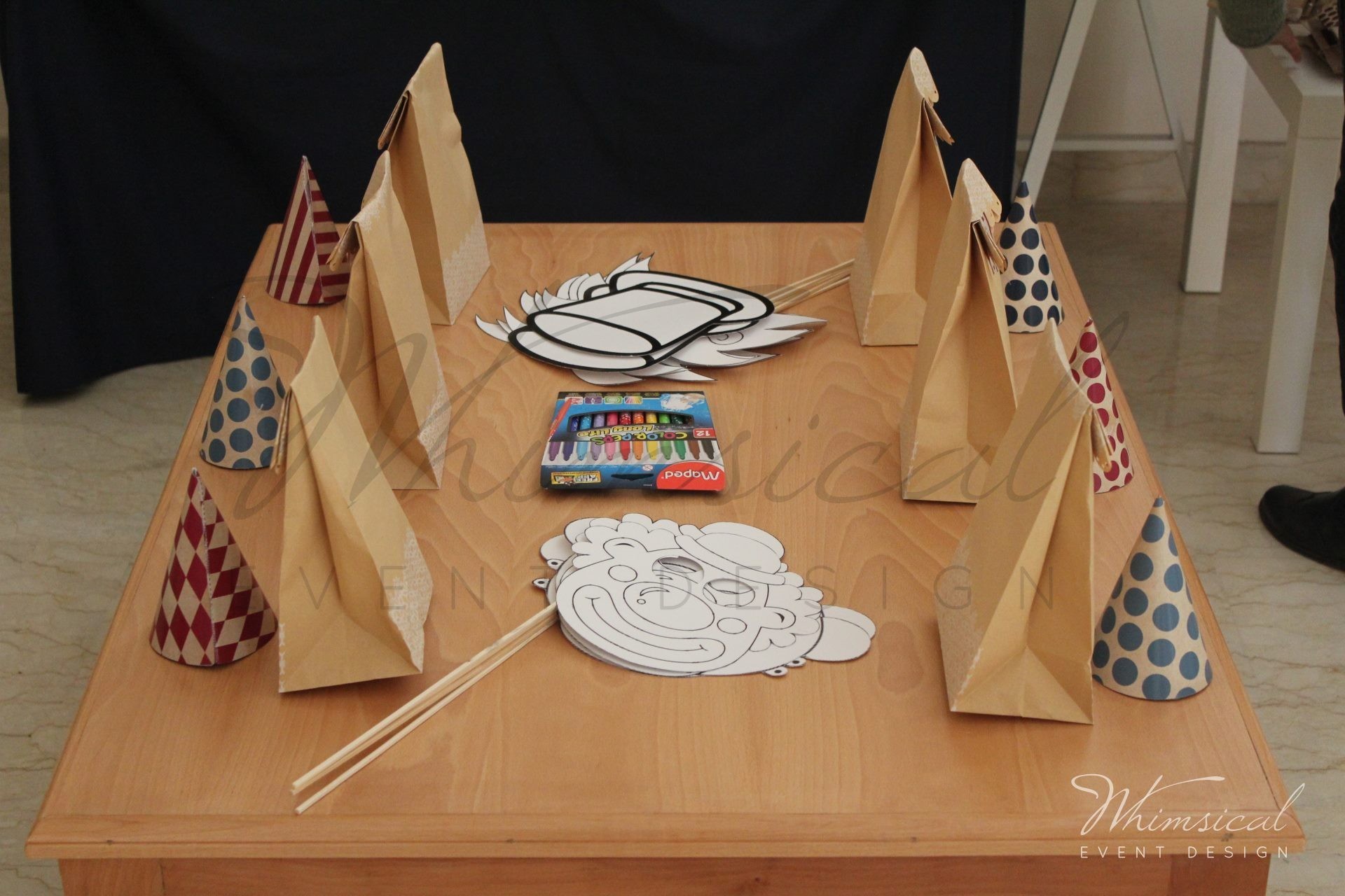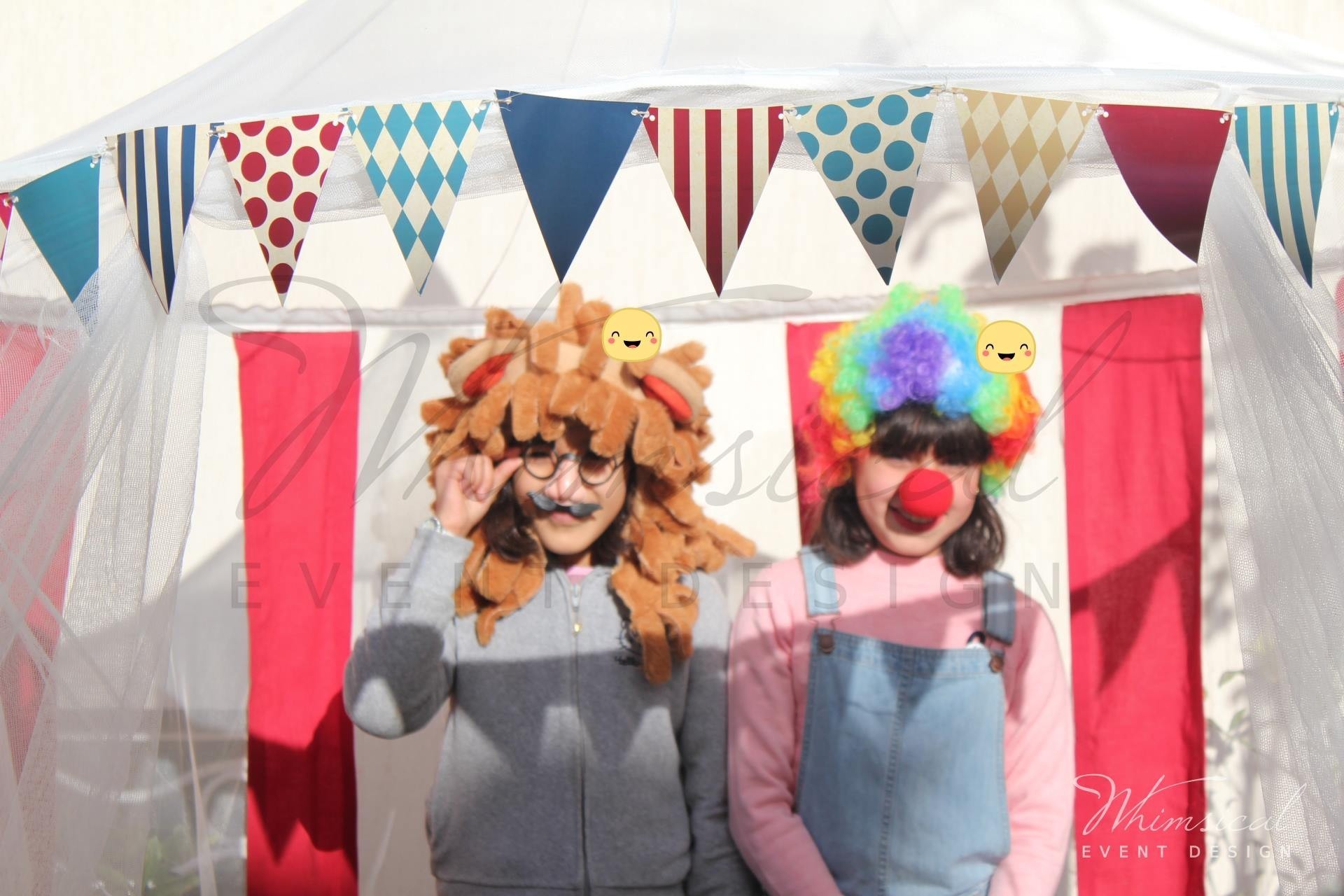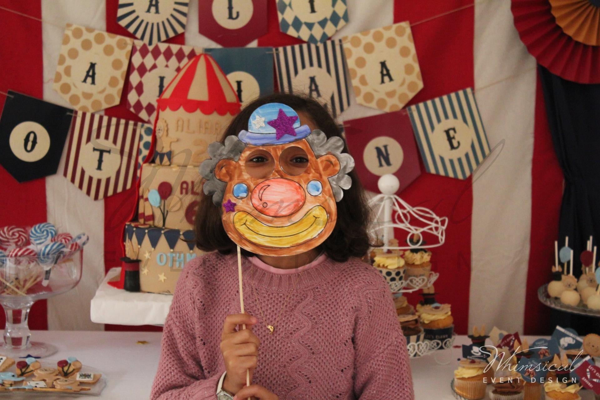 Un vrai petit carnaval, avec une décoration en draps de tente de cirque, des caissettes vintage, des rosettes en papier au thème, des tickets d'entrée, des tickets de jeux. des masques et chapeaux à colorier, des fun boxes, et bien sûr des gâteaux en thème. Le photobooth étaient sous forme de tente de cirque, avec des props, des animaux et caissettes. Les enfants ont fini par le considérer comme un QG.